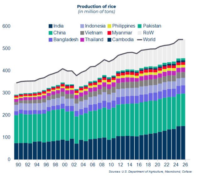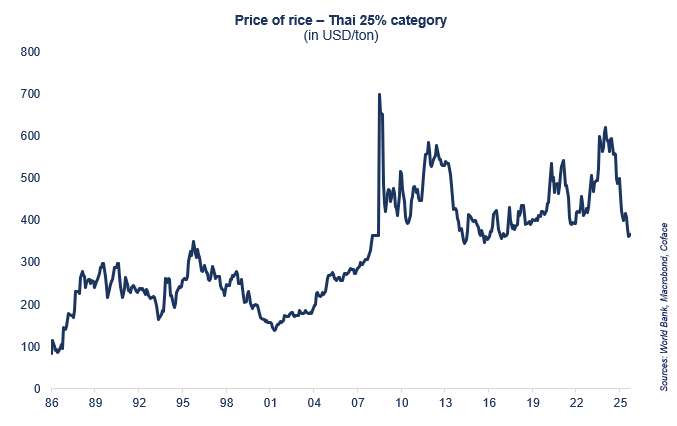 Desde 2022, India, el principal exportador mundial, había restringido sus exportaciones para contener el aumento de los precios internacionales (incremento del 19 % en 2022 y 2023), provocado en particular por la guerra en Ucrania y las condiciones climáticas adversas en Asia. La reapertura de las exportaciones en 2024, junto con cosechas récord en Asia, han provocado una caída del 35 % en los precios en un solo año. Dadas las previsiones de aumento de la producción para 2026 y el posible regreso del fenómeno de La Niña en el cuarto trimestre de 2025, se anticipa un excedente creciente de oferta en 2026. Se espera que los precios sigan bajando al menos hasta finales de 2025, con una posible estabilización en 2026 en niveles no vistos en los últimos diez años.